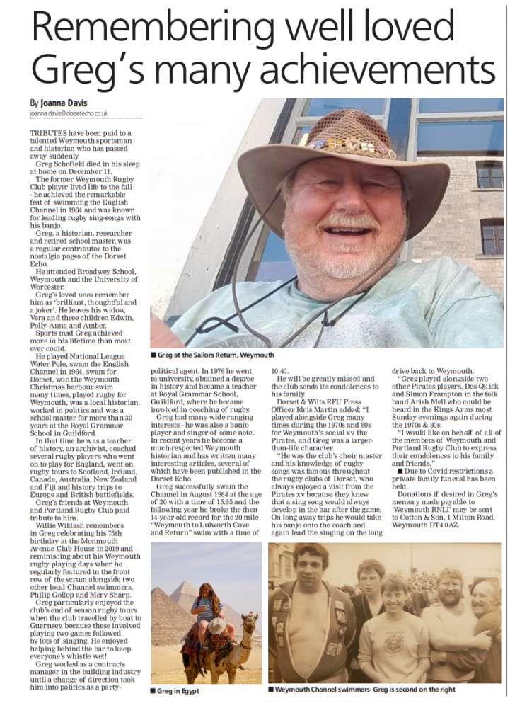 Donations if desired in Greg’s memory made payable to ‘Weymouth RNLI’ may be sent to Cotton & Son, 1 Milton Road, Weymouth DT4 0AZ.